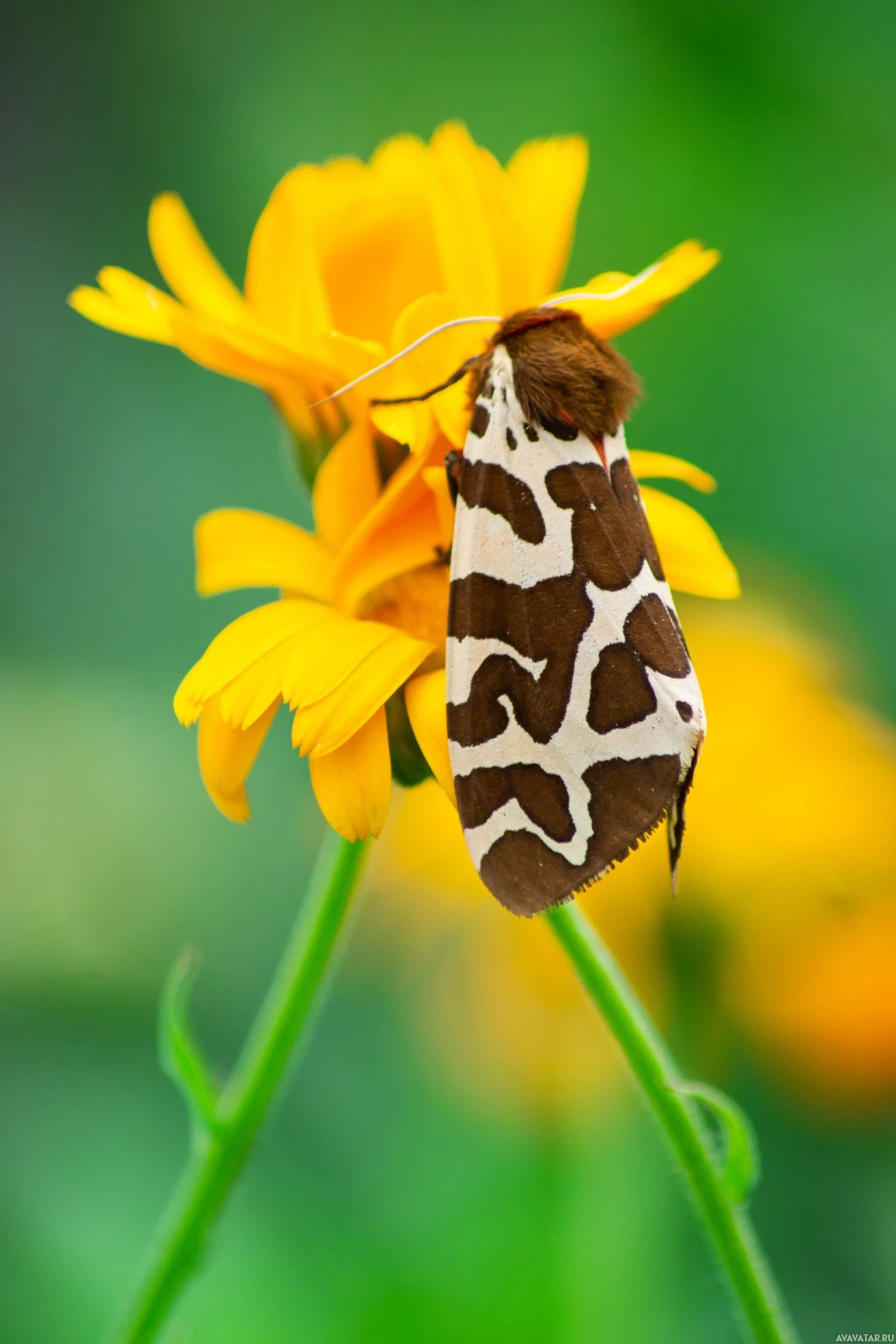 На картинке изображена бабочка, сидящая на цветке. Этот конкретный тип бабочки известен как стеклянная бабочка, которая распознается своими прозрачными панелями крыла и отличительным пятнистым рисунком. Цветок выглядит как подсолнечник или похожий желтый цветок.
