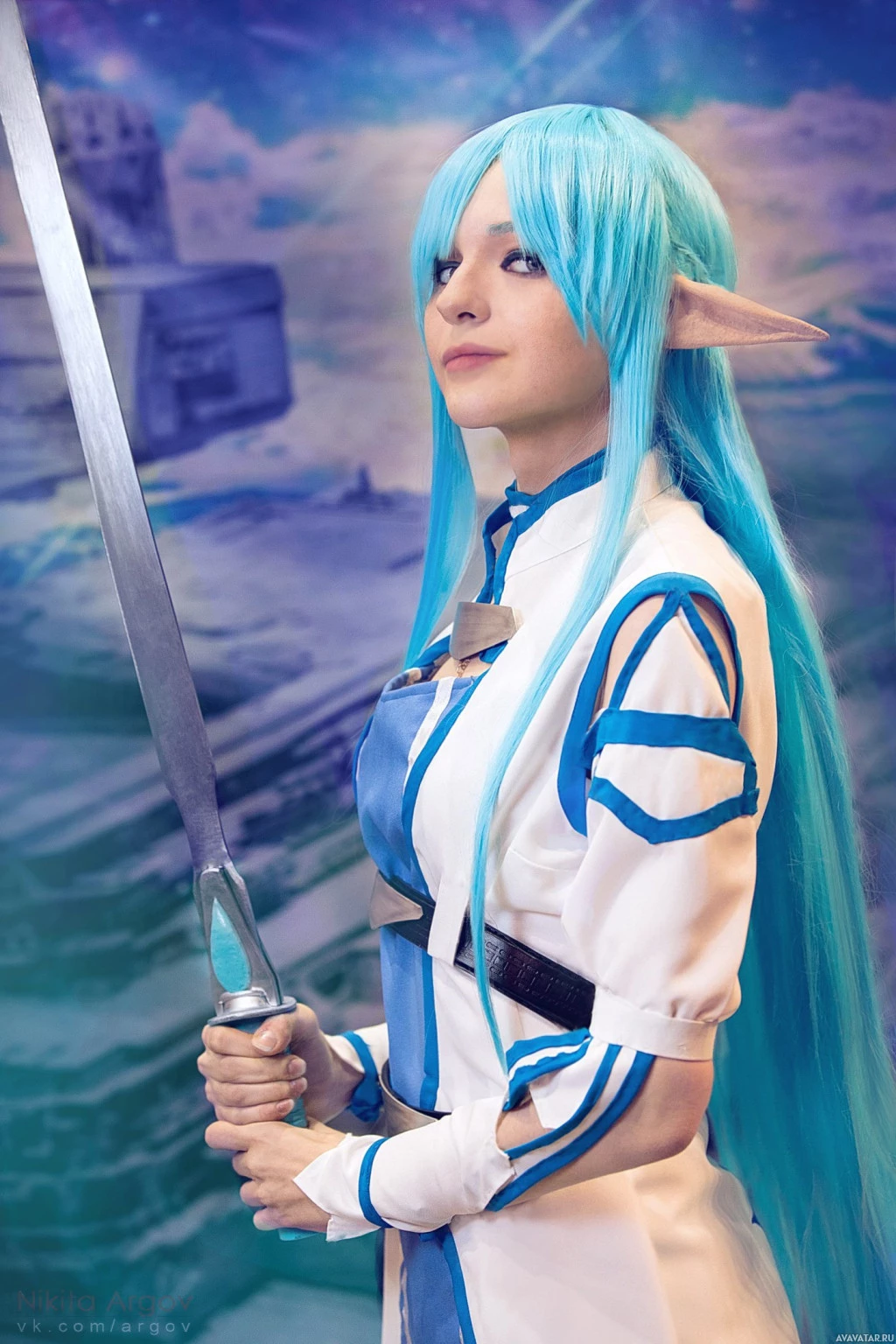 The image features a person cosplaying as a character from the fantasy series "Final Fantasy". This character is known for her elven features and magical abilities. She is holding a sword, which is typical of characters with combat roles in fantasy settings. Her long blue hair and detailed costume are characteristic of the style found in cosplay events.