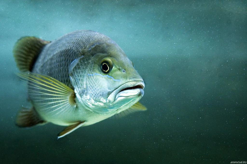 prominent eye and the shape of its mouth. This fish appears to be underwater, as suggested by the greenish water and