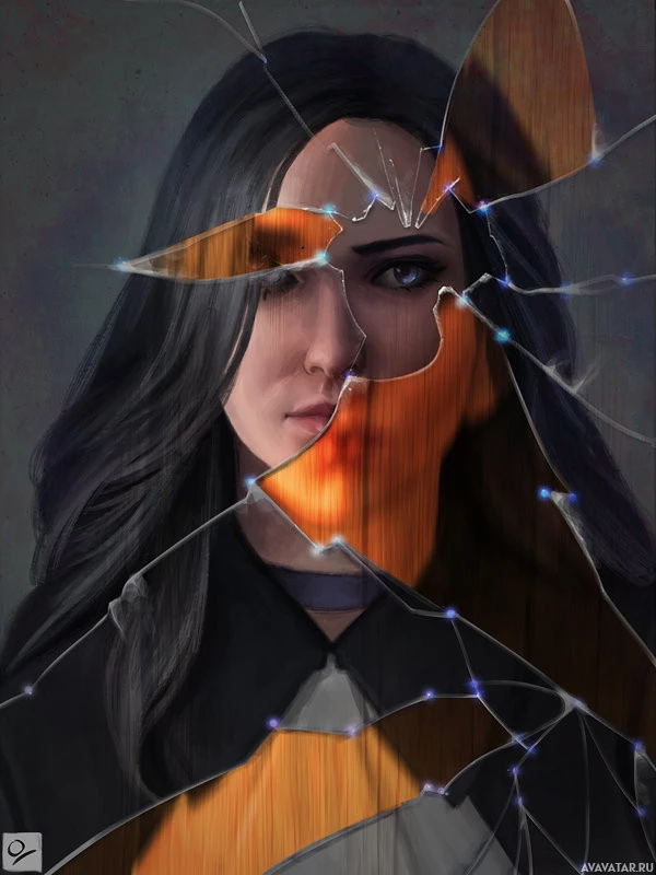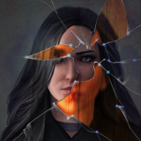 shattered glass and cracks overlaying her image. The style is reminiscent of a classic portrait, but it also incorporates modern