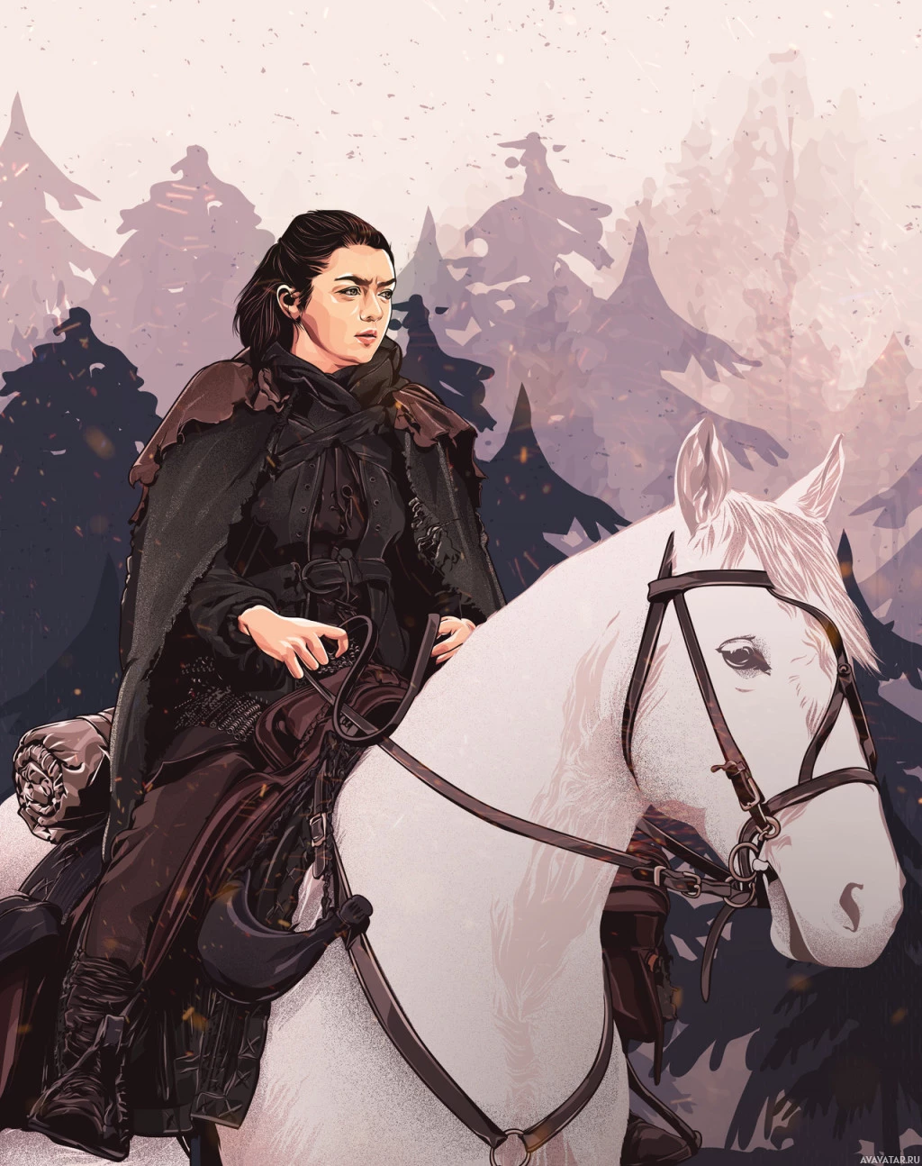 Daenerys Targaryen, is seated on a horse in a forested area that resembles a wintery landscape. The character is wearing medieval-style clothing and is looking to her right with a determined expression.