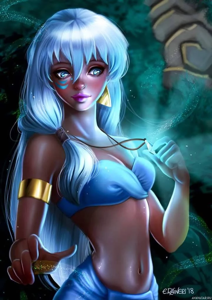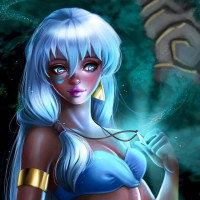 a female character who appears to be inspired by ancient Egyptian attire, complete with a headdress and jewelry. She has long