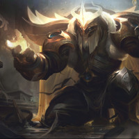 pointed ears and a stylized headdress. The background shows destruction, possibly indicating