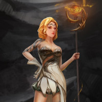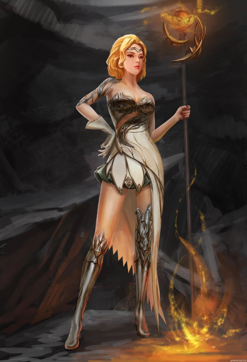 a female character with blonde hair, dressed in a fantasy-themed outfit that includes armor and a cape. She is holding a staff that appears to be