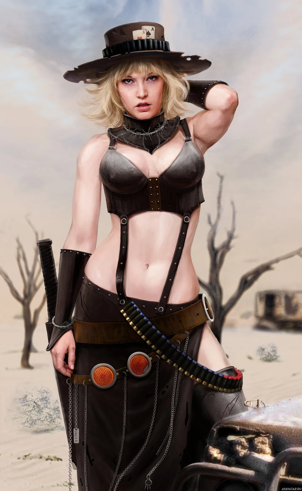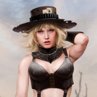 Картинка показывает женского персонажа, носящего то, что кажется западным или пустынным нарядом, в комплекте с шляпой и аксессуарами, которые создают впечатление стиля ковбоя или ковбоя. Она стоит в пустыне, что предполагает авантюрную или ориентированную на действия тему.