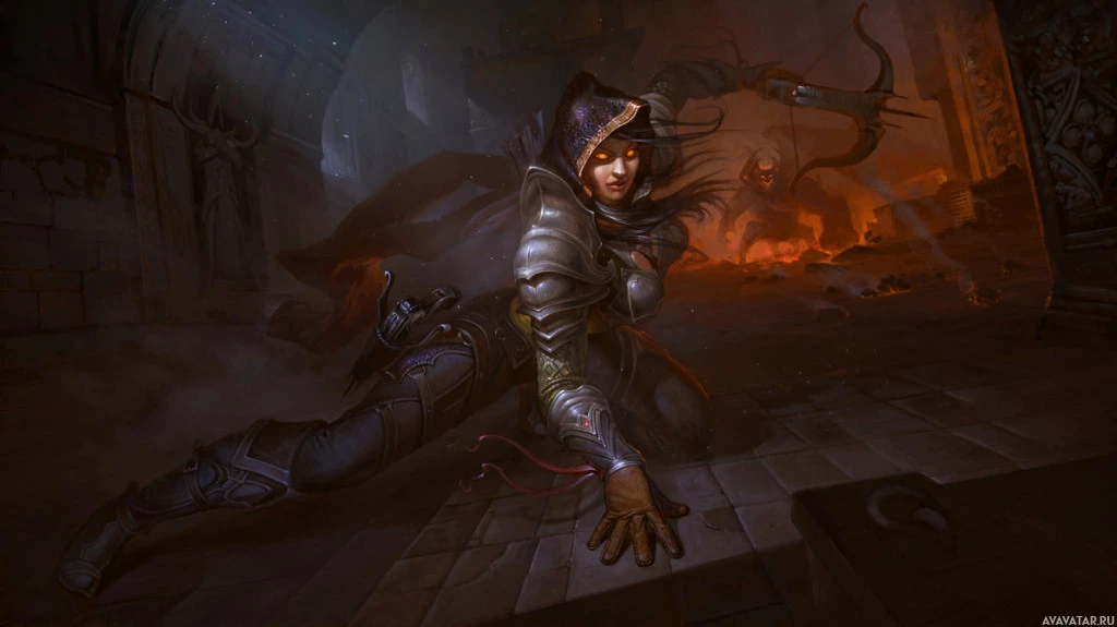 the video game "Diablo," specifically known as a Demon Hunter. The character is depicted in