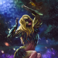 a fantastical creature with feathered attire, and she is holding a small bird in her hand. She appears to be sitting on a rock or ledge in an enchanted