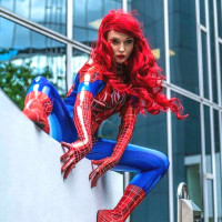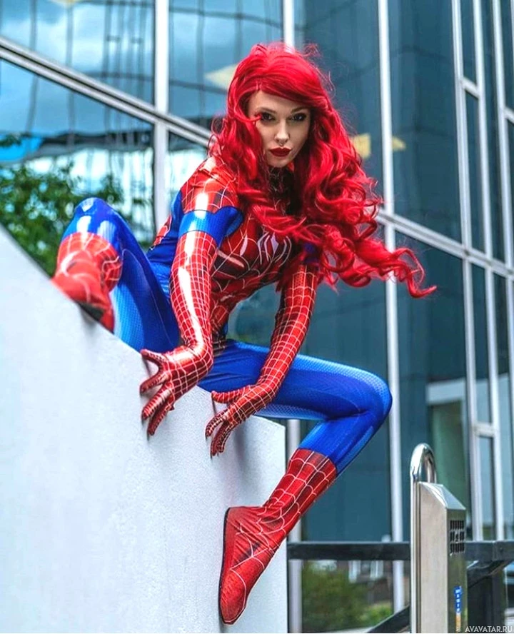 The image features a person dressed as Spider-Man, specifically in the costume of Mary