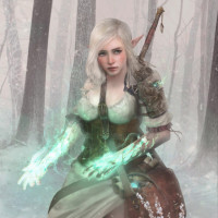 blonde hair and pointed ears typical of elves in many fantasy stories. She is holding what looks like a staff with glowing runes, suggesting she may have