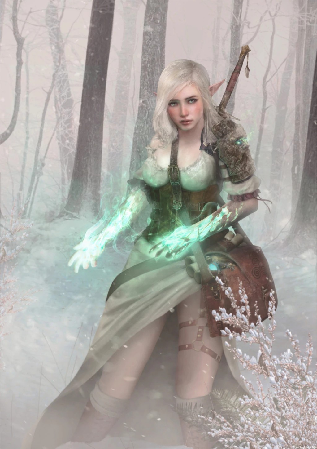 The image shows a fantasy-themed character resembling an elf. She is sitting in the midst of what appears to be a snowy forest or glade, with mist or fog creating