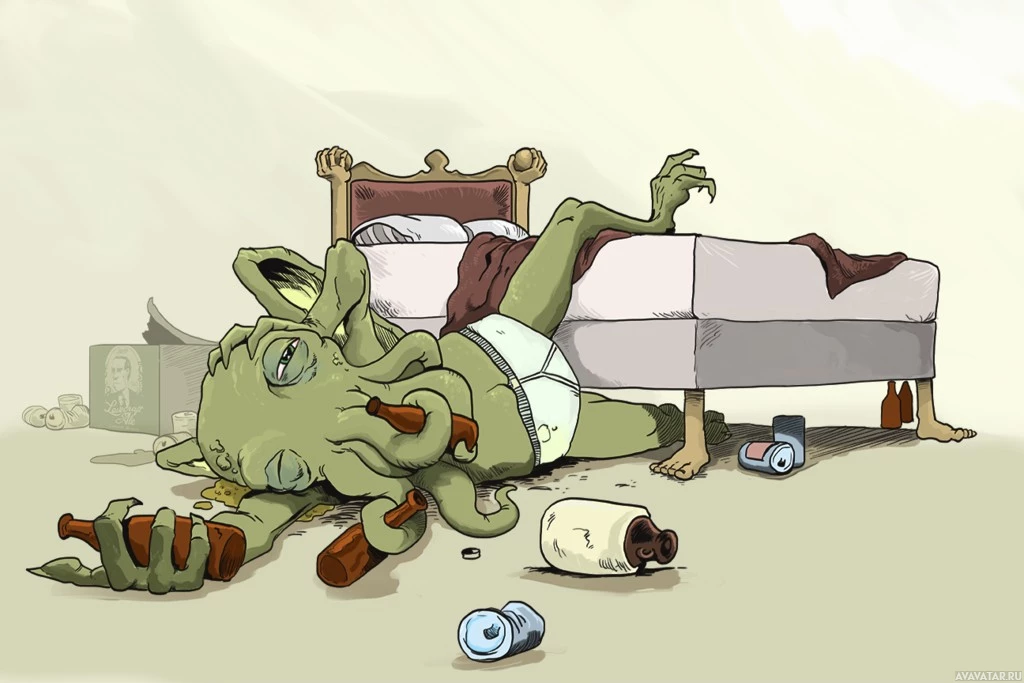 a giant octopus or a humanoid with an aquatic appearance. In this picture, Cthulhu is depicted lying on a bed that's disheveled and scattered with various items such as bottles, cups, and trash. The room has a neglected, messy look to it, which adds to the humorous or fantastical nature of the image. It's