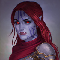 red hair and striking purple eyes, which might suggest magical or otherworldly powers. She is wearing a suit of armor with intricate designs on it, which could indicate she is a warrior or a fighter in