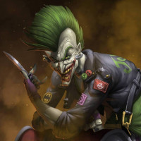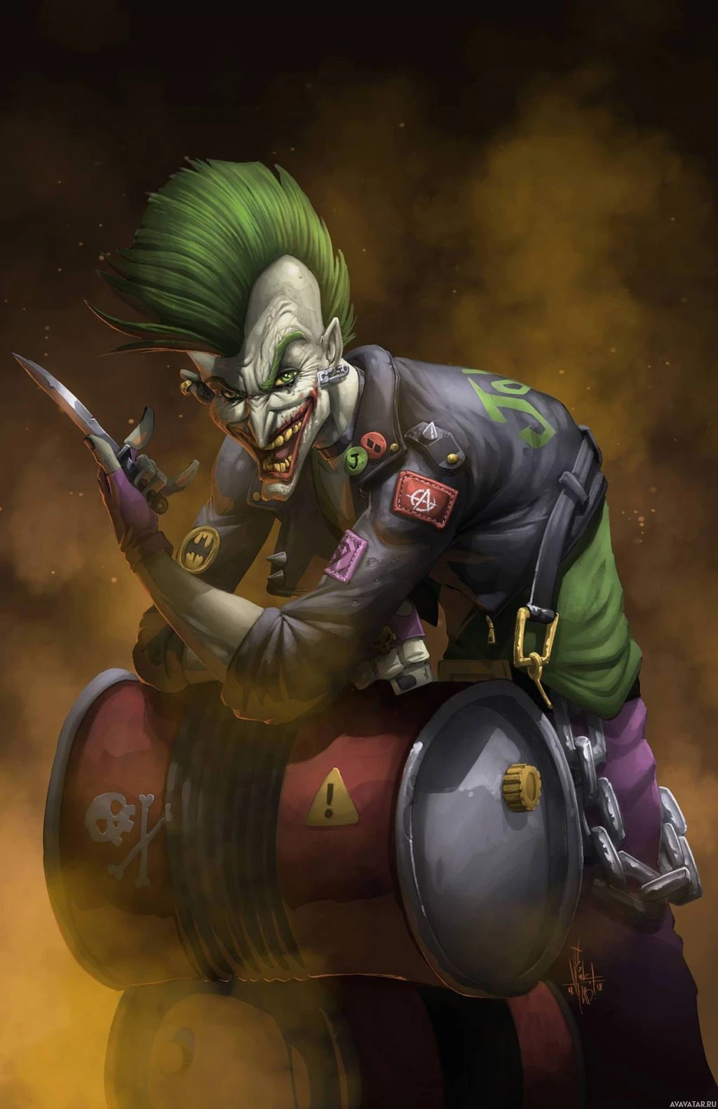 The image depicts an illustration of a character resembling the Joker from the "Batman" series. This character is known for his