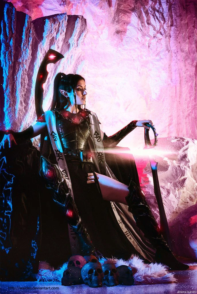 a rock formation that looks like part of a cave or underground dwelling, with a glowing red light illuminating their face and the surrounding area. The person is wearing dark attire with various embellishments, possibly including armor pieces or accessories, which suggest a mystical or powerful character within this