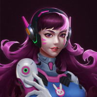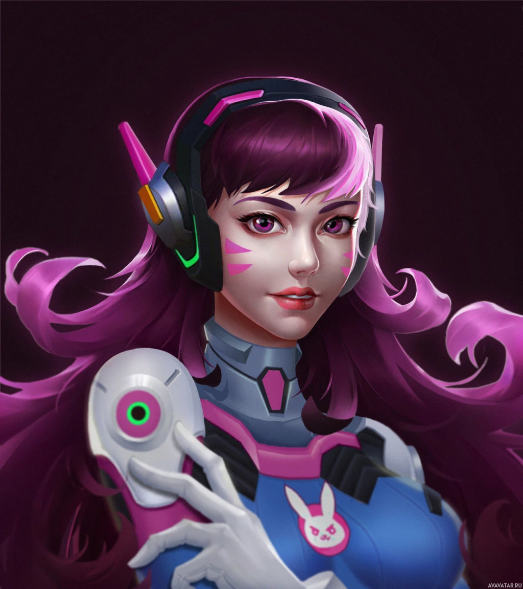 a female character with purple hair and a futuristic design, reminiscent of characters from the video game "Overwatch." She is wearing headphones and has