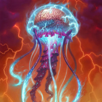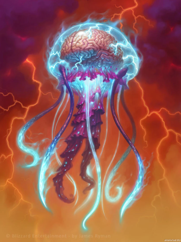 a human brain instead of its usual head. The creature appears to be glowing with blue and purple light, suggesting some sort of magical or otherworldly energy. It's set against