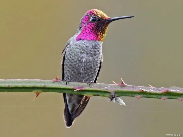 На картинке изображен колибри, сидящий на ветке с кактусовыми шипами. Птица имеет отличительные цвета, обычно связанные с мужским разнообразием видов, которые часто отображают яркие оттенки для привлечения партнеров или отталкивания хищников.