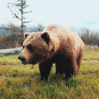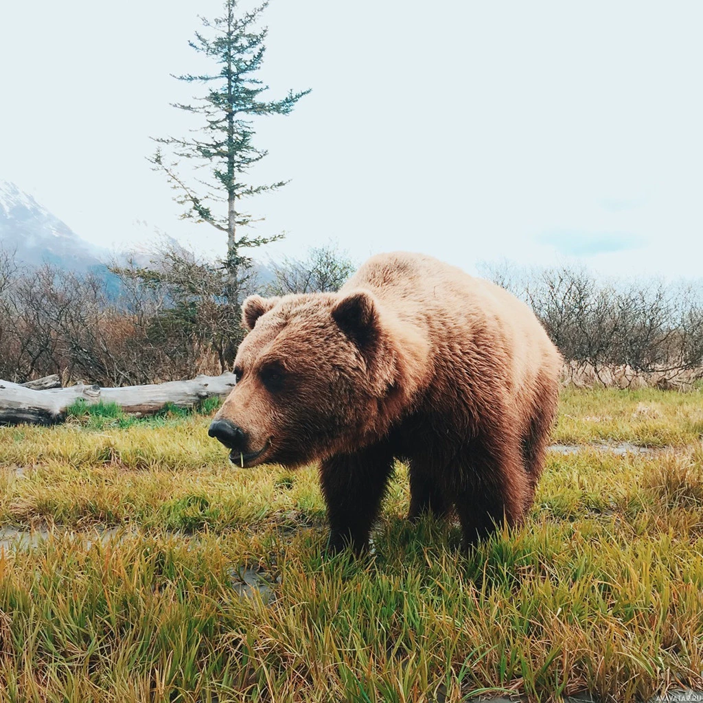 На картинке изображен бурый медведь, стоящий на травянистом поле или лугу с деревьями и горами на заднем плане. Медведь отворачивается от камеры, глядя влево.
