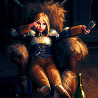 blonde hair. She is sitting on what seems to be an old-fashioned throne or chair, wearing armor and holding