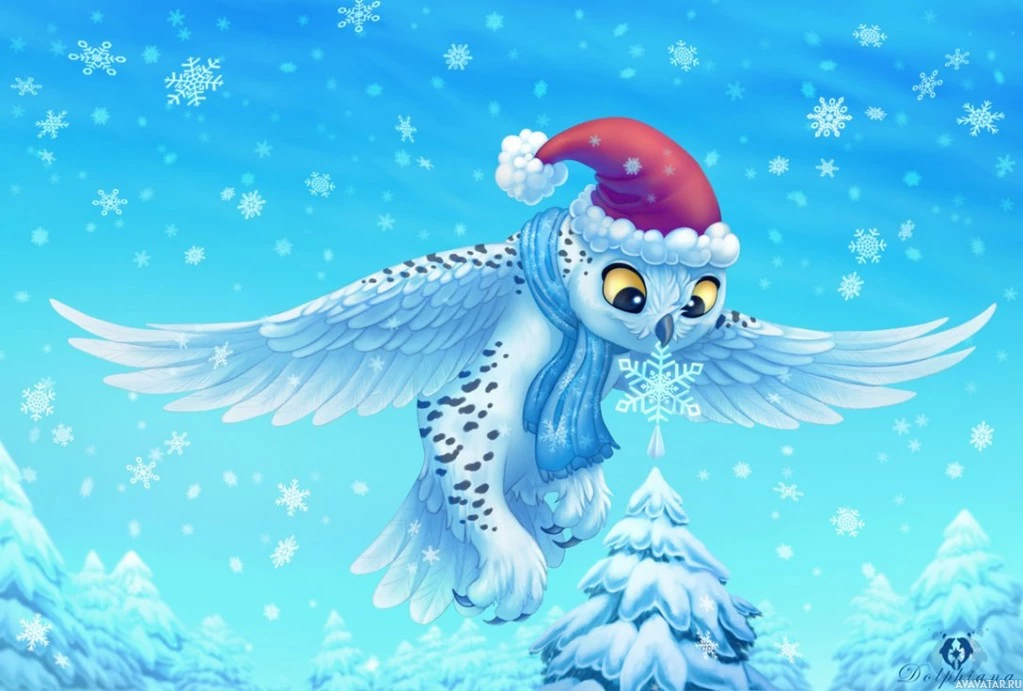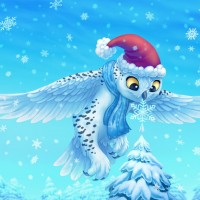 a Santa hat and scarf. It appears to be a festive, holiday-themed illustration with snow falling and a clear