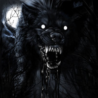 an intense expression and blood dripping from its mouth, suggesting a violent or menacing act. The background is dark and includes silhouettes of trees that resemble bones, contributing to