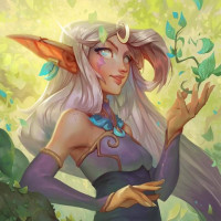 blonde hair and pointed ears, which are characteristic features of elves in many fantasy genres. She is holding what appears to be a magical flower or plant in her hand, suggesting she might have