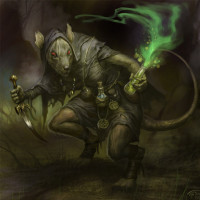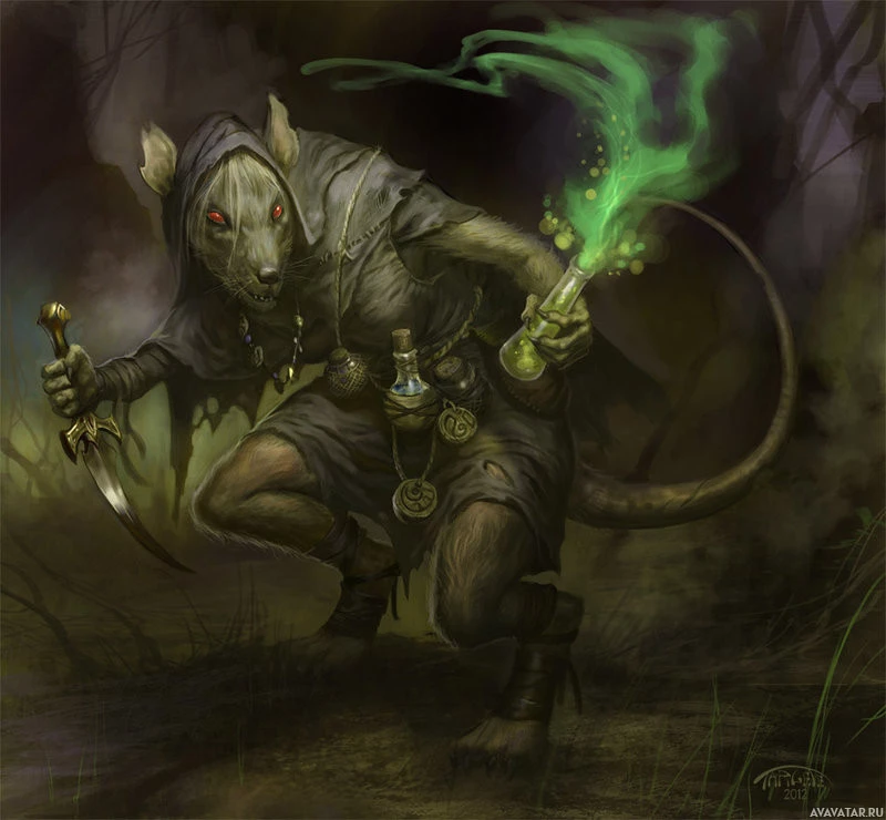 a mutant rat with human-like features. The rat is standing upright, dressed in what looks like
