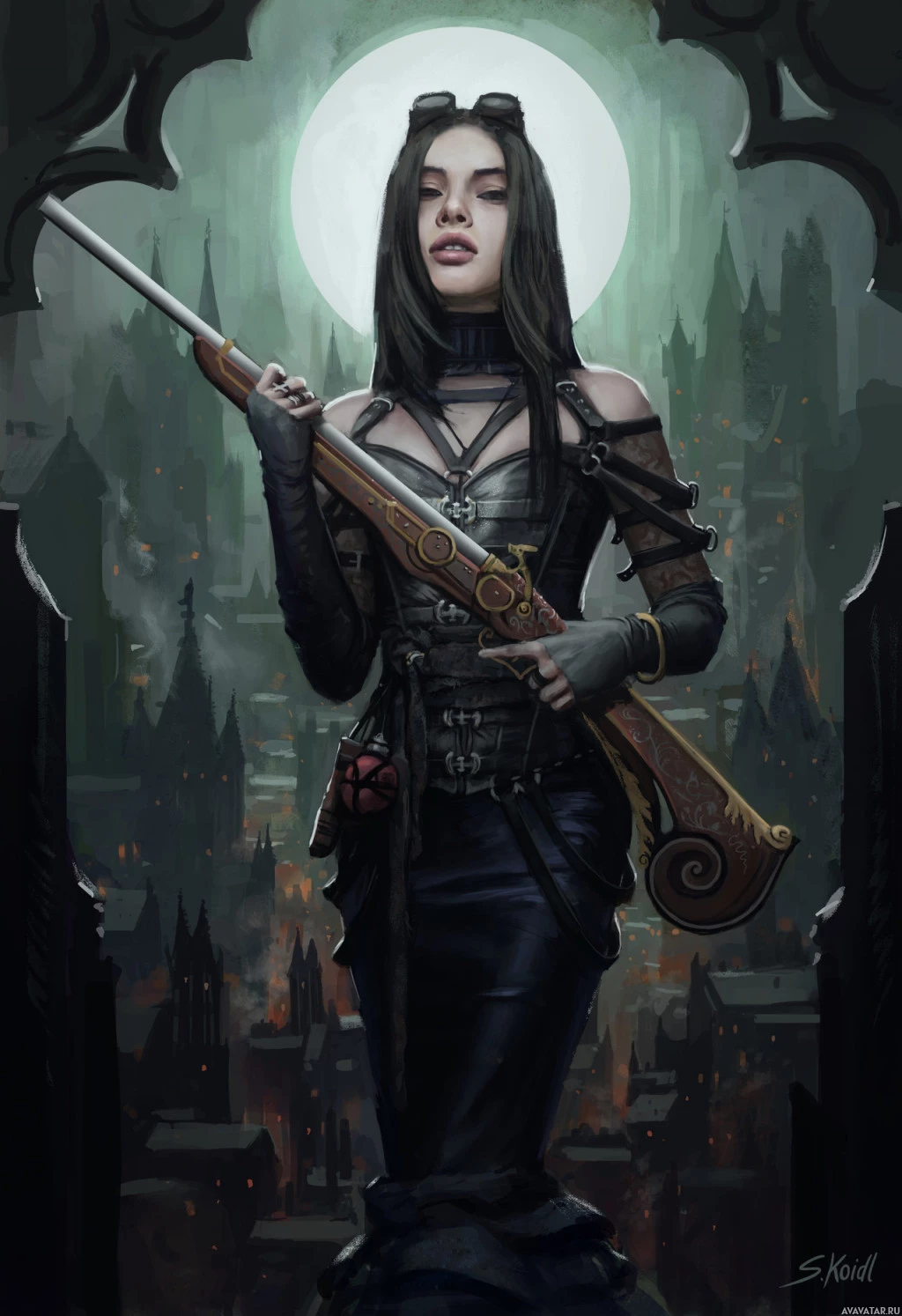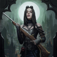 a brunette girl holding a weapon. She is dressed in a style that could be considered steampunk or fantasy, with elements such as gears and