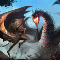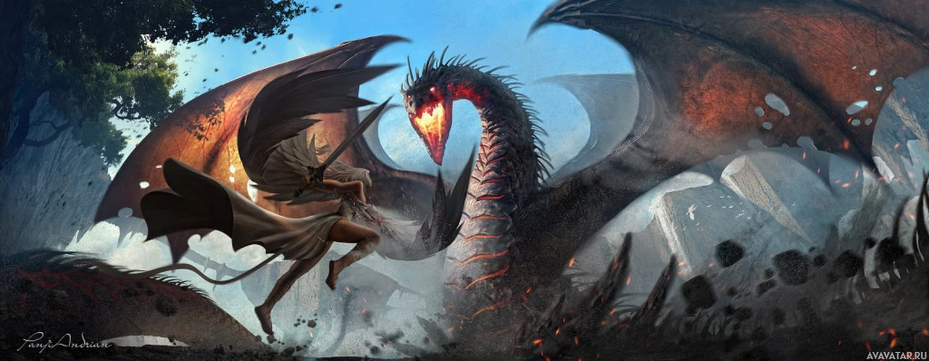 a fantasy scene with elements of both dragons and angels. There's a large,
