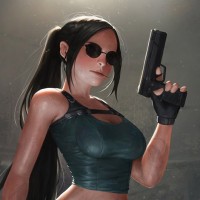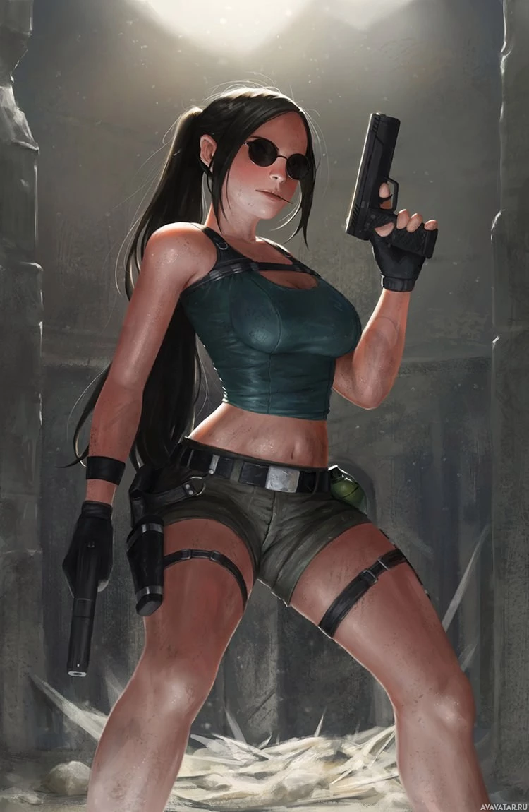 wearing sunglasses, which are iconic elements associated with Lara Croft. The character is standing in what appears to be