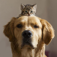 На снимке изображена собака золотого цвета с кошкой на спине. Собака, кажется, в помещении, и кошка удобно лежит на спине собаки. Собака имеет спокойное выражение лица и, кажется, принимает присутствие кошки. Сцена отражает момент, который предполагает уровень доверия и гармонии между различными видами.