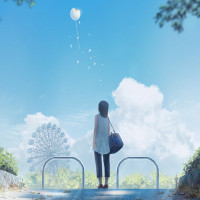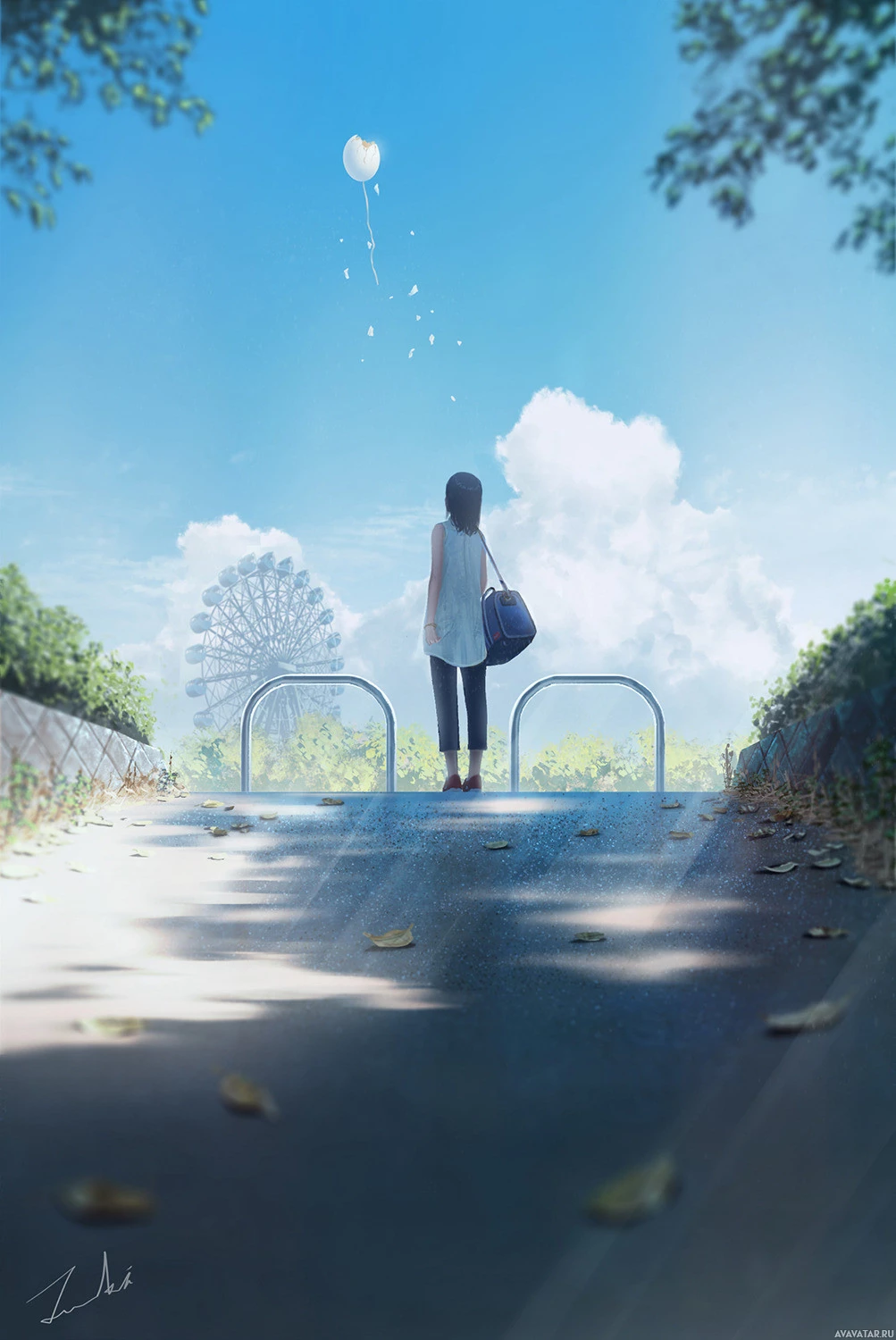 a gentle breeze suggested by her hair being slightly disheveled, and the weather seems pleasant with some clouds in the sky and trees around. The setting appears to be an urban or suburban area during