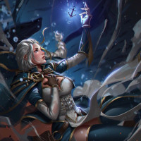 a confident expression and her arm outstretched as if casting a spell or using magic. Her attire includes a blue cape and robe, along with
