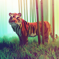 bamboo forest. The tiger is facing the viewer with a calm and