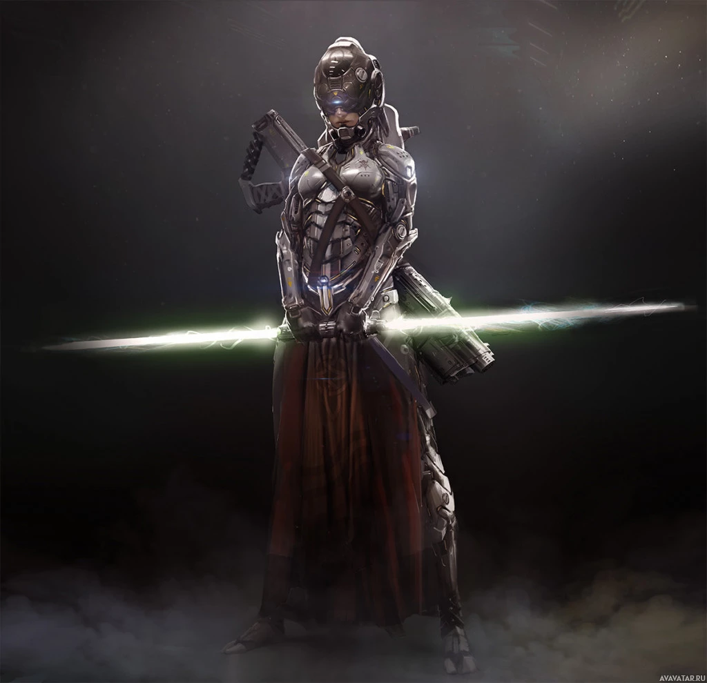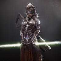 advanced armor and weaponry that are characteristic of the game's fantasy and science fiction elements. The setting appears to be in space or another