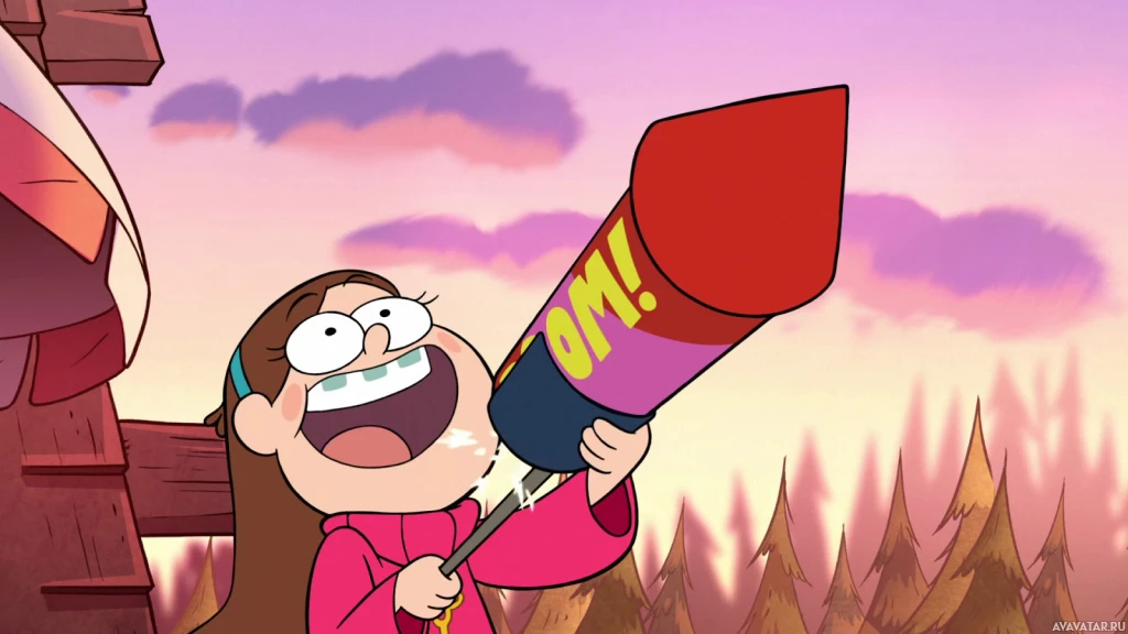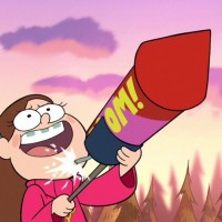 an animated character, Mabel Pine, from the animated series "Gravity Falls." She appears to be holding a firework with her mouth open as if she's about to launch it. The background suggests that the scene is set during sunset or at night, given