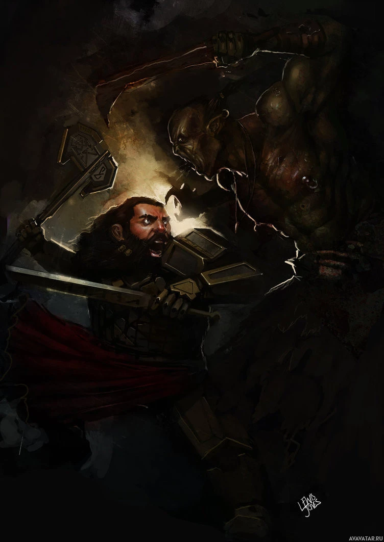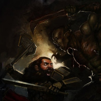 fantasy universe. This character seems to be engaged in combat against two other figures: one that resembles an orc and another that looks like a hulking creature, reminiscent of a troll or similar