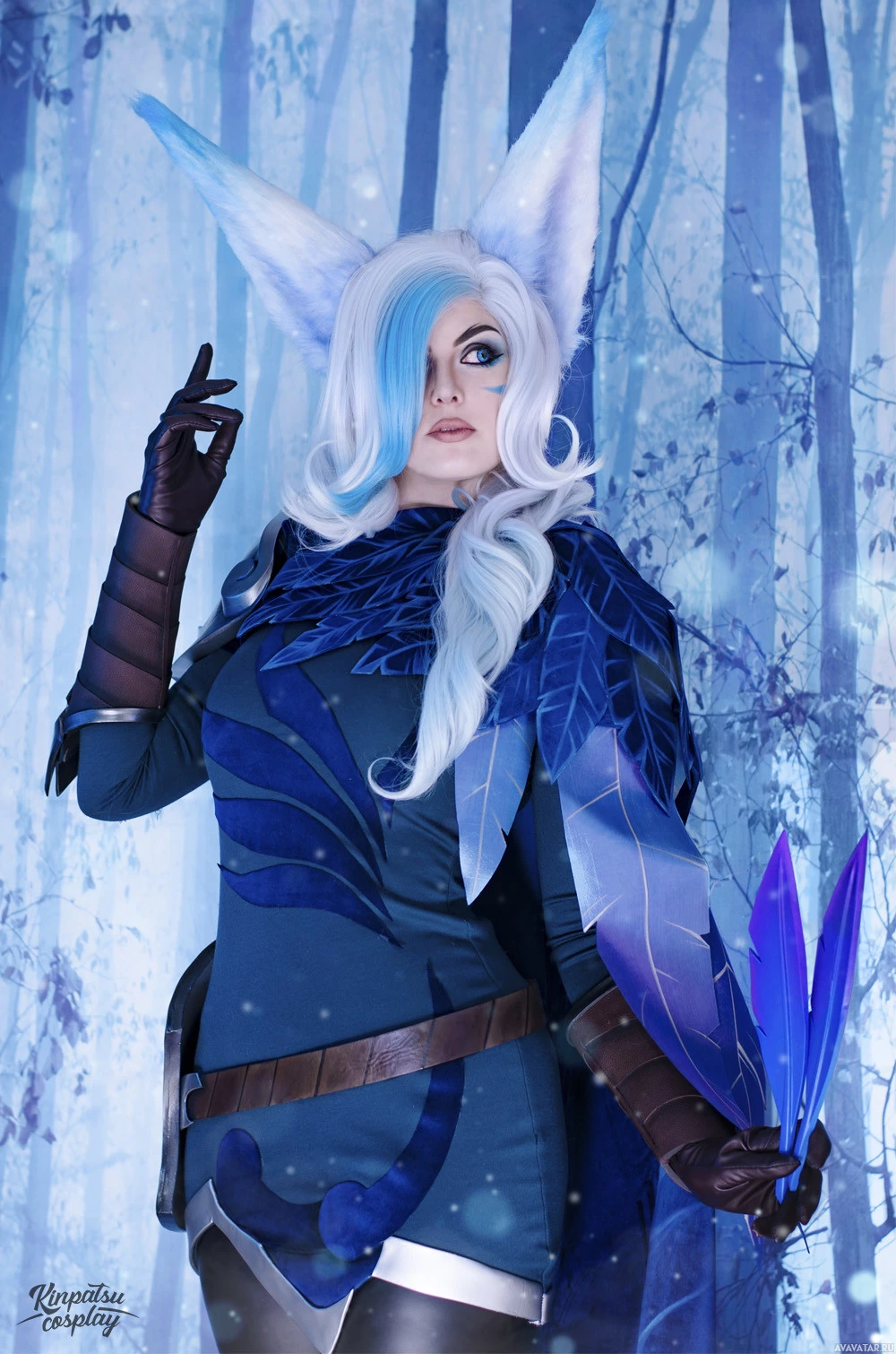 League of Legends." The individual is wearing a costume that includes elements inspired by fantasy or sci-fi genres. They have white and blue hair, which could be associated with the character they are portraying. Additionally, there appears to be a sword held in their left hand, suggesting that the character may be a warrior or fighter type in the game's lore. The background is designed to look like a forest or