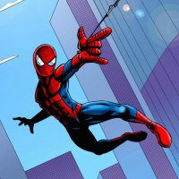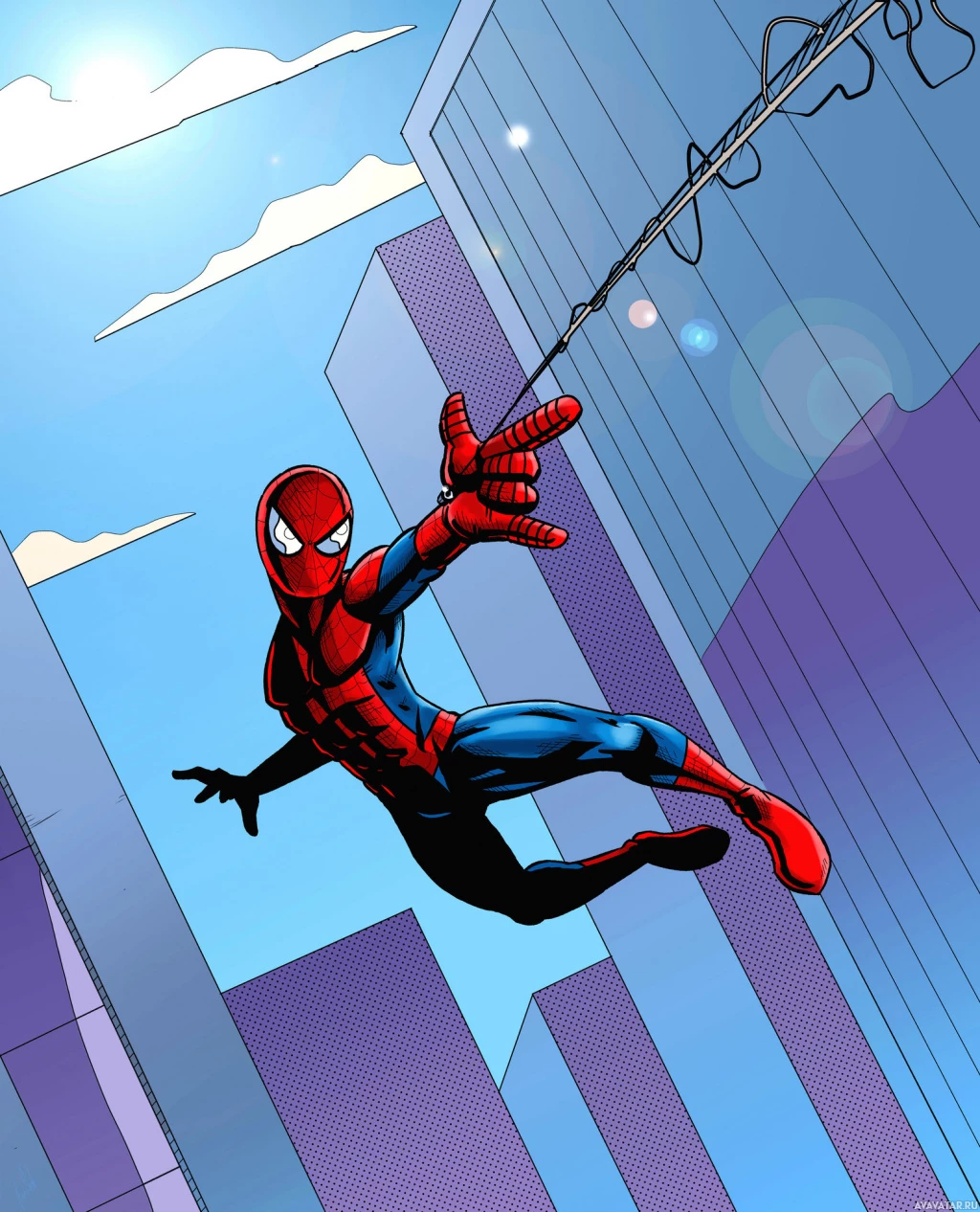book character, Spider-Man. He is shown in his iconic red and blue costume, complete with a web shooter on each wrist. Spider-Man is mid-flight,