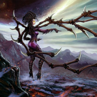 a fantasy scene with a character that appears to be Kerrigan, from the game Starcraft. She is depicted with an ethereal and powerful presence, holding out a hand as if commanding or controlling something not visible in the frame. The background suggests a battlefield or