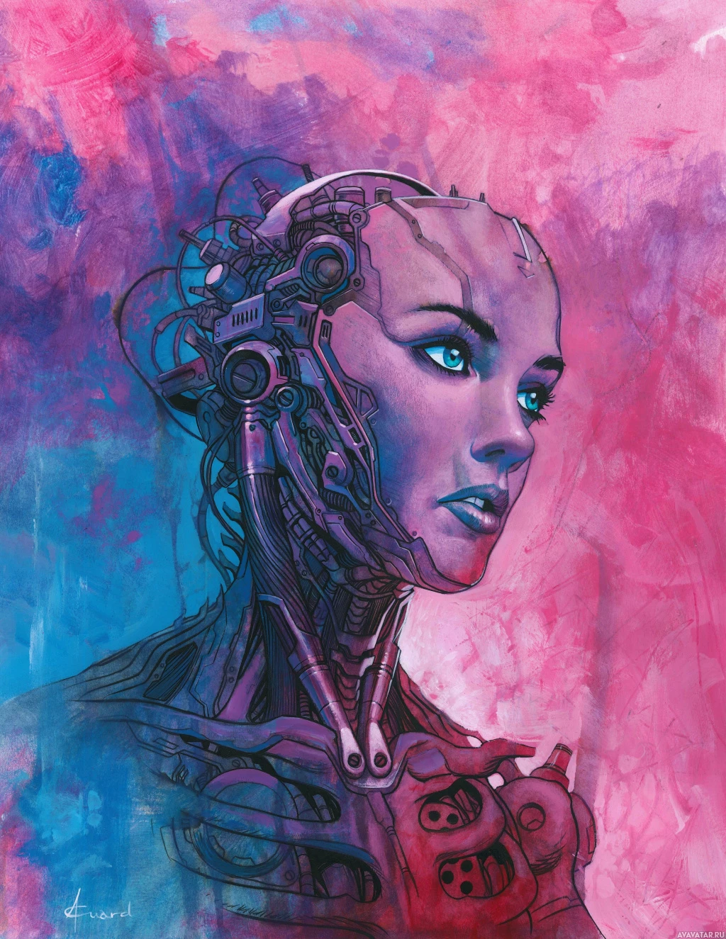 The image depicts a stylized, artistic representation of a robot. The robot appears to have human-like features such as eyes and lips, but the mechanical elements suggest it is not organic. It's designed in a way that blends organic and mechanical components, which is often associated with