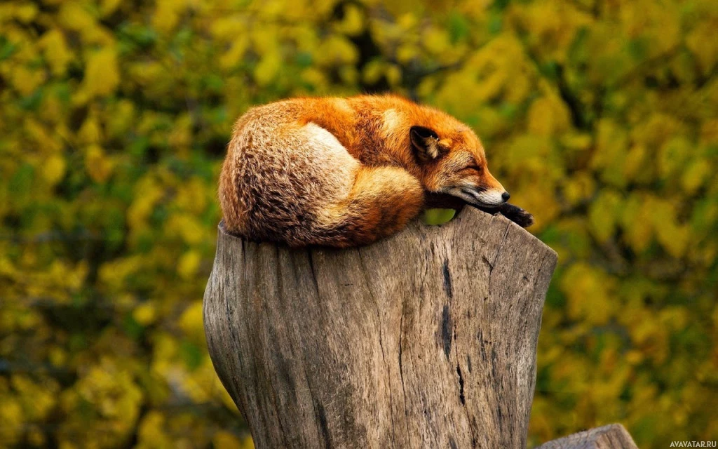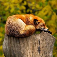 На картине изображена лиса, покоящаяся на том, что кажется пнем дерева. Лиса скручена и кажется непринужденной, возможно, спит или просто отдыхает в естественной среде обитания.