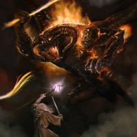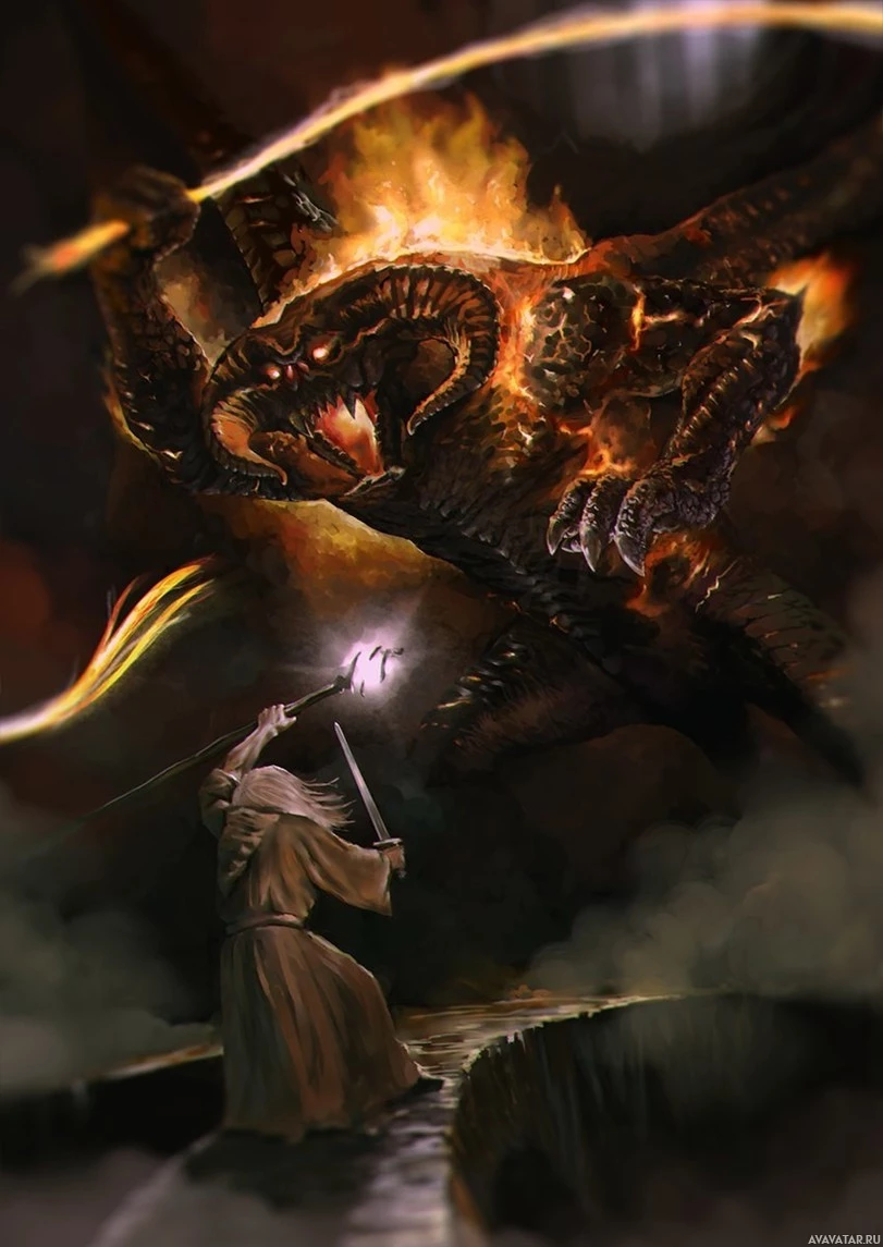 In this picture, there is a character who appears to be Gandalf from J.R.R. Tolkien's Middle-earth series, confronting
