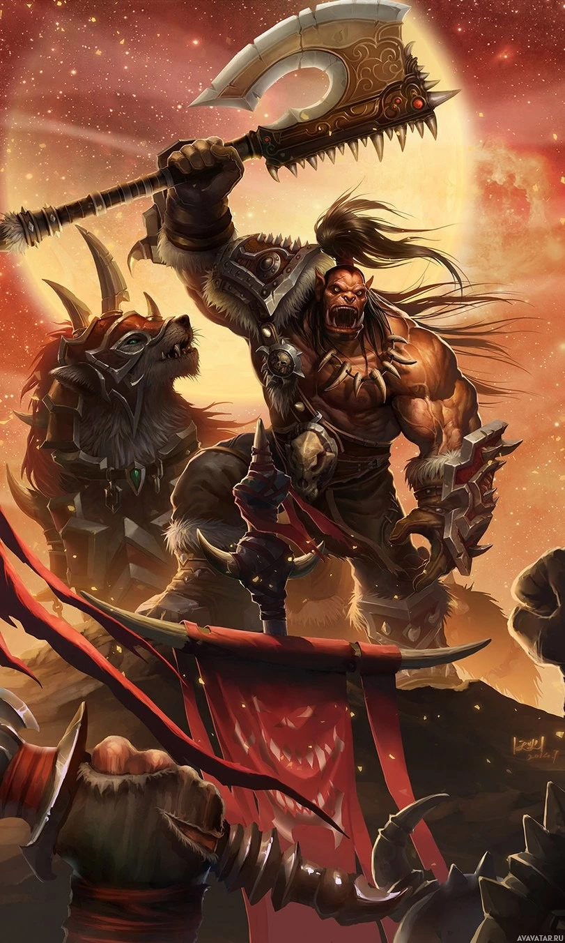 an orc warrior. The orc is depicted holding a large, two-bladed axe and is wearing armor with a helmet that has what appears to be red