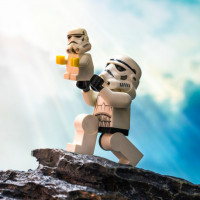 the Star Wars franchise. One character appears to be dressed in the armor of a stormtrooper, which is typically associated with