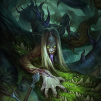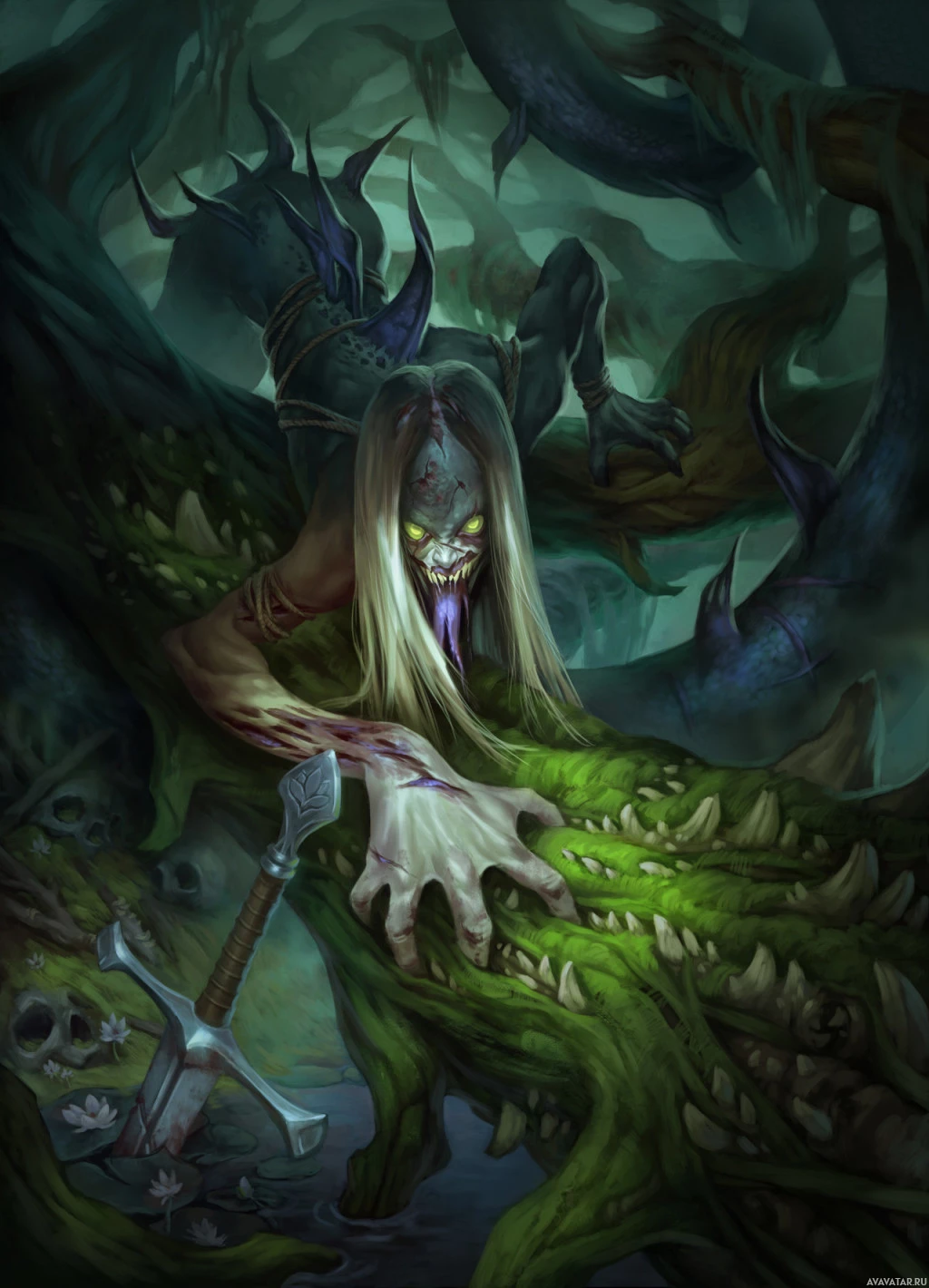 The image depicts a fantasy or horror-themed illustration. It features an otherworldly creature with sharp teeth, clawed hands, and