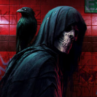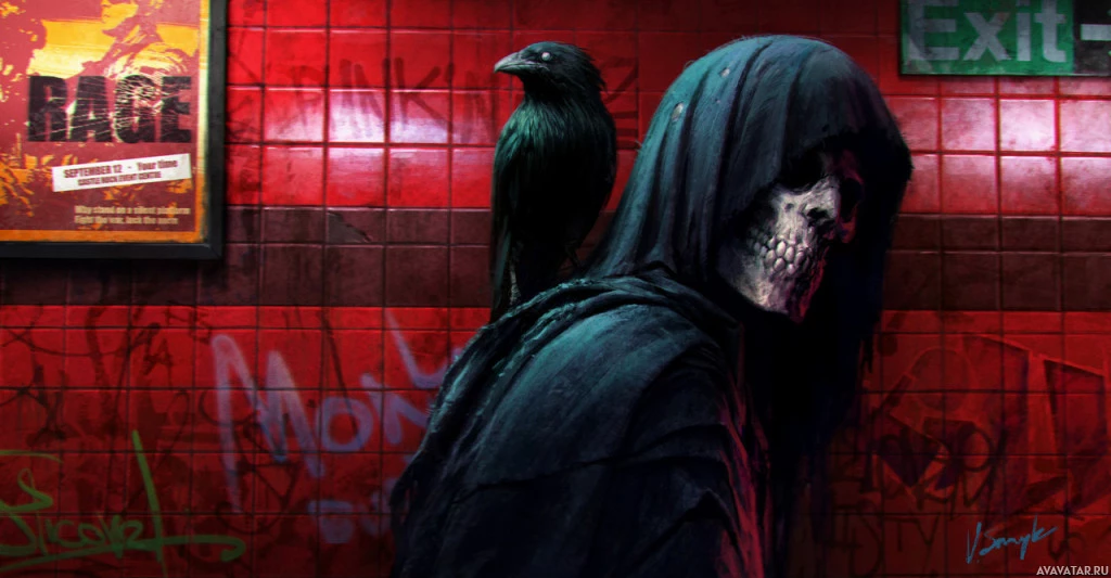На картинке изображен персонаж в капюшоне и то, что кажется маской скелета. На заднем плане сидит птица, которая выглядит как знак выхода со стрелкой, указывающей вверх. Общий тон изображения довольно мрачный и зловещий.