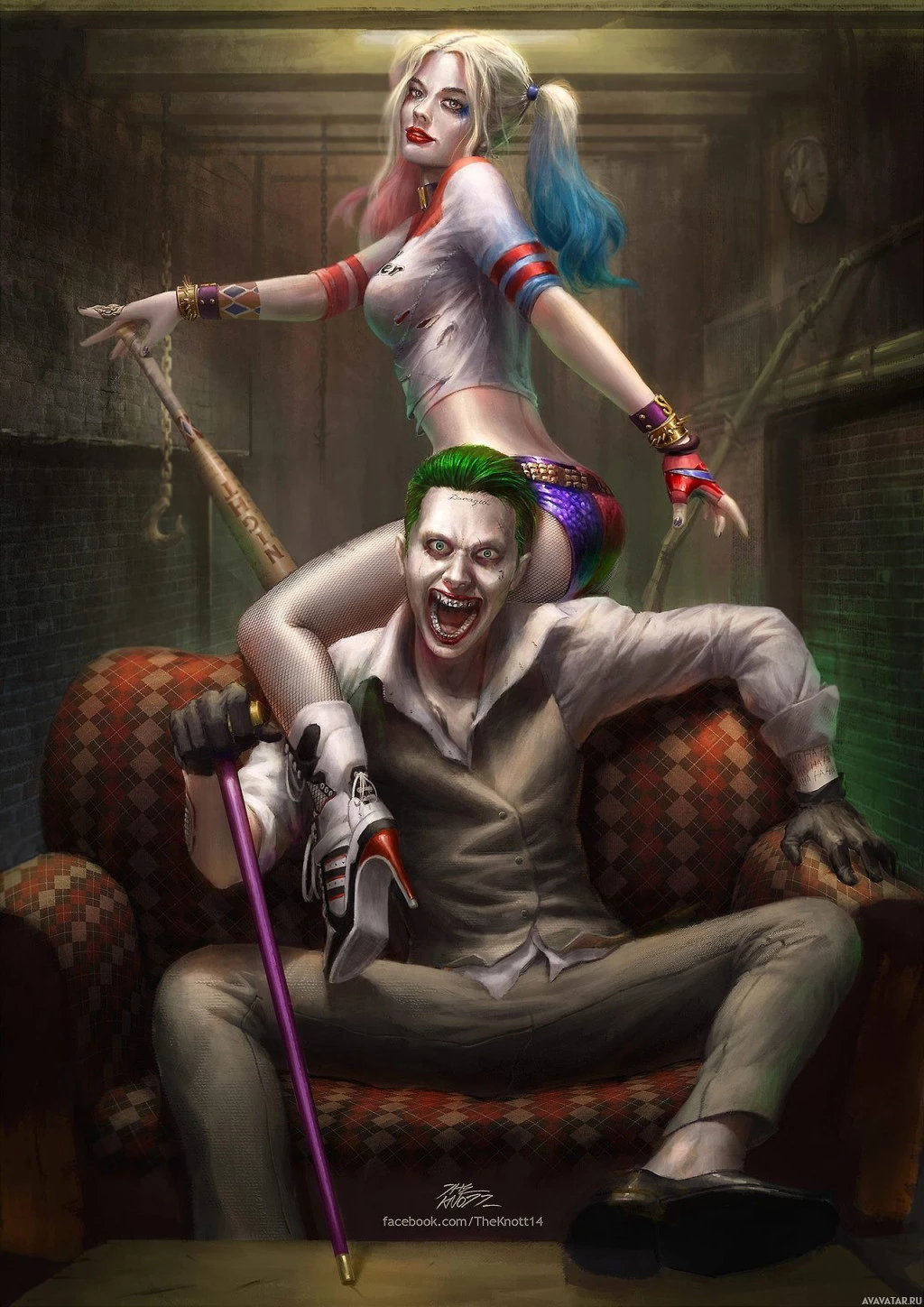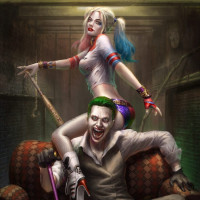 Harley Quinn and the Joker, from the Batman universe. Harley Quinn is seated on the shoulders of the Joker, who is lying down on a couch with his arms stretched out to either side. Both characters are dressed in their iconic costumes: Harley Quinn in her black and red outfit, complete with her signature pearls, and the Joker in his colorful suit and makeup that includes