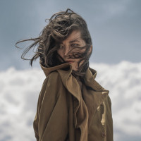 a cloudy day, as evidenced by the clouds in the sky and what seems to be a light breeze or wind blowing her hair slightly. She is wearing
