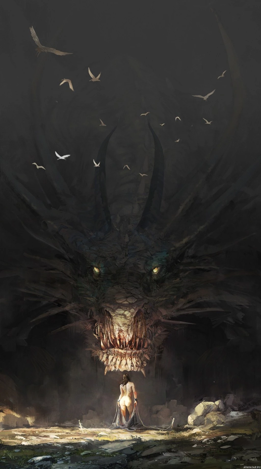 a large dragon that appears to be awake and guarding the entrance. The setting suggests an epic or adventurous theme, as indicated by the presence of birds flying around in the background, adding to